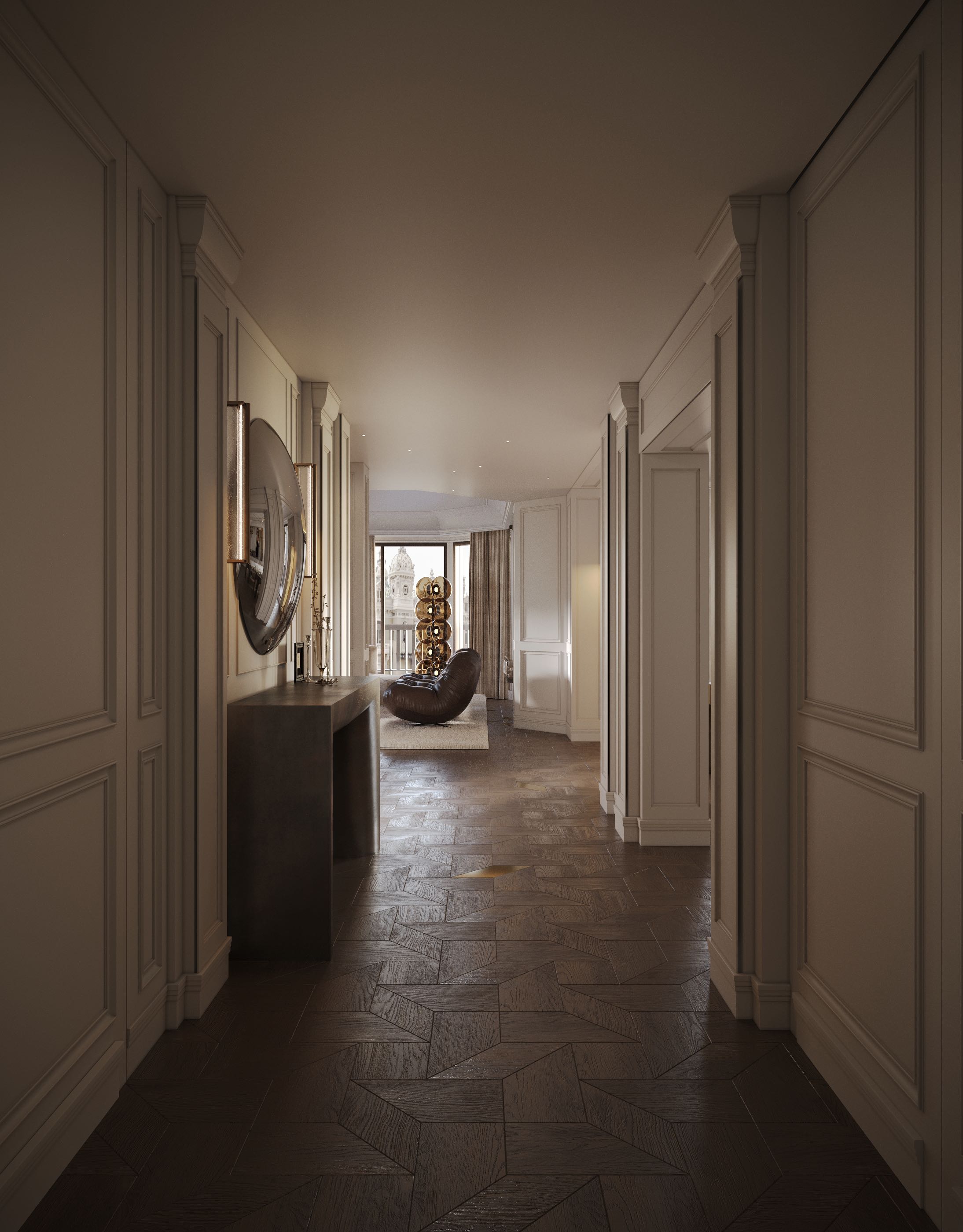 Classical wall paneling defines the architectural framework of the interiors, lending depth, rhythm, and quiet grandeur to each room. These refined details pay homage to the noble spirit of Monaco’s historic residences, where craftsmanship and tradition shape the atmosphere. The moldings and panels create a sense of permanence and structure, establishing a distinguished backdrop that elevates the entire composition. Against this architectural canvas, contemporary furnishings introduce a subtle contrast — clean silhouettes, sculptural forms, and curated textures bring lightness and modern sophistication. This interplay between classical structure and modern design infuses the apartment with a unique charm, achieving a balance that transcends trends and anchors the space firmly in timeless elegance.